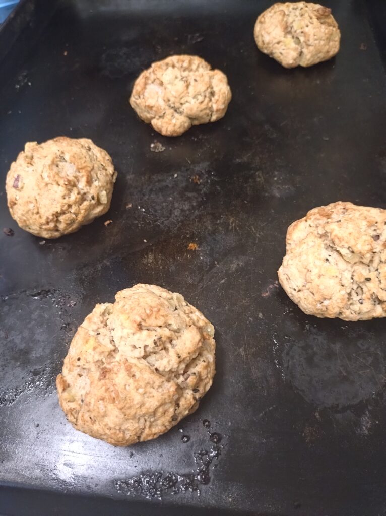 CONTENTS コンテンツ 2025.10.04 さつまいもスコーン ブログ 本日は10月の新商品さつまいもスコーン(税込220円)のご紹介です。全粒粉と米粉生地にダイスさつまいもと黒ごまを練り込んで焼き上げました。 一覧へ戻る
