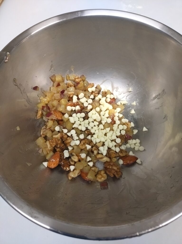 バター、メープルシロップ、練乳をさつまいも、クルミ、アーモンドにからめて、ホワイトチョコを入れて、生地に練り込みました。