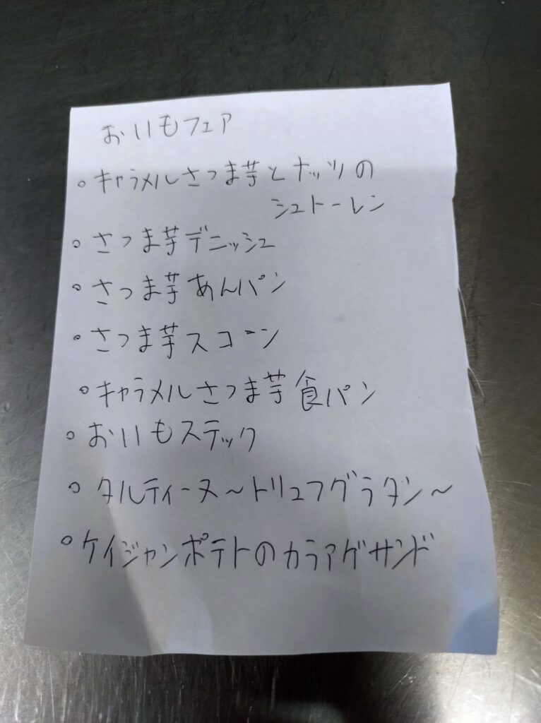CONTENTS コンテンツ 2025.09.20 来月の新商品 ブログ 来月のフェアです。食パンは引き続きレーズン食パンは作ります。クルミ、紅茶は材料はあるので、2日前までに言っていただいたら作ります。 一覧へ戻る
