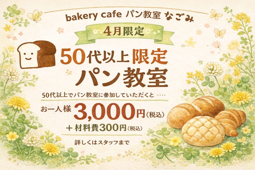 CONTENTS コンテンツ 2026.03.26 4月限定パン教室 ブログ 4月限定のパン教室です。次回は50代以上限定のパン教室です。お一人様でも何人かでご参加でも大丈夫です。通常のパン教室も常時開催してますので、そちらも引き続きおまちしてます! 一覧へ戻る